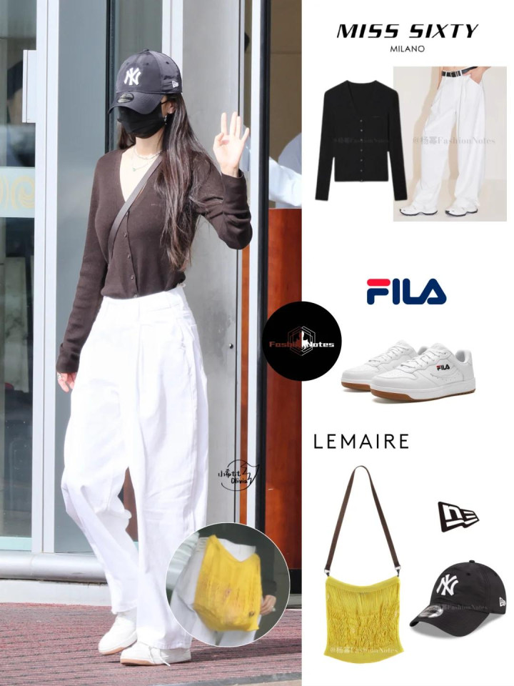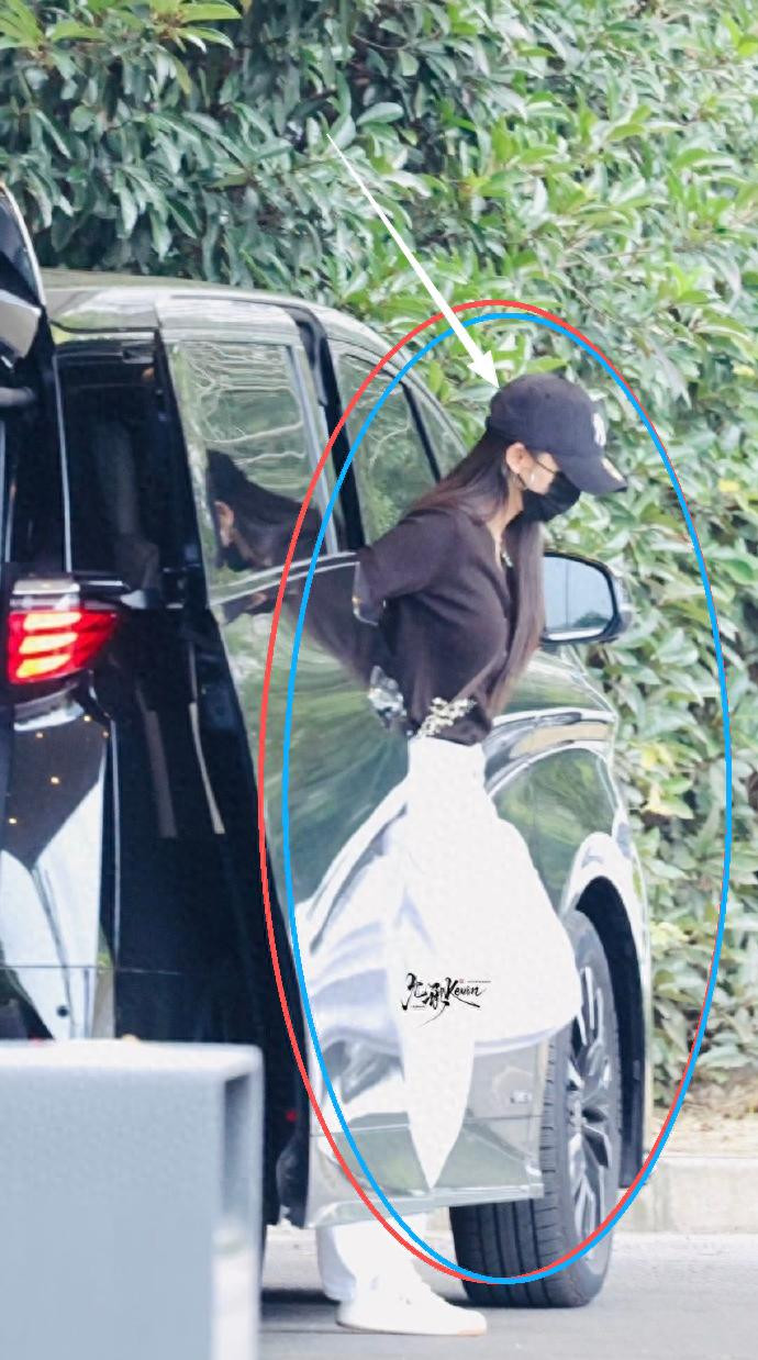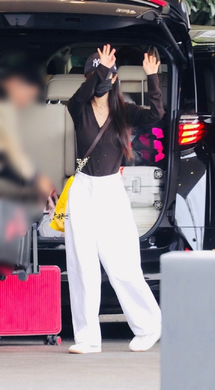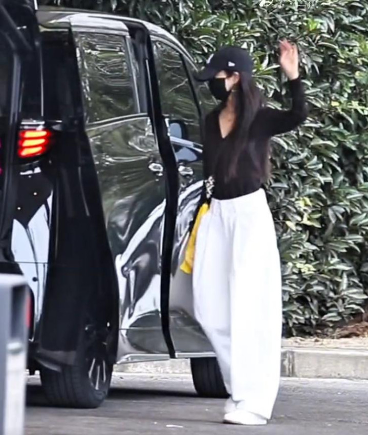 柔顺长发及腰,黑色修身上衣白色阔腿裤和平底鞋,脸部被帽子口罩遮得严严实实,但依旧有路人粉能一眼认出来她。